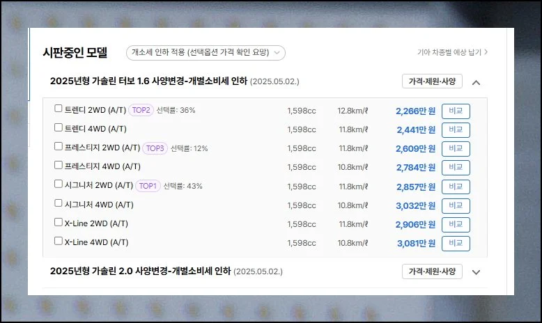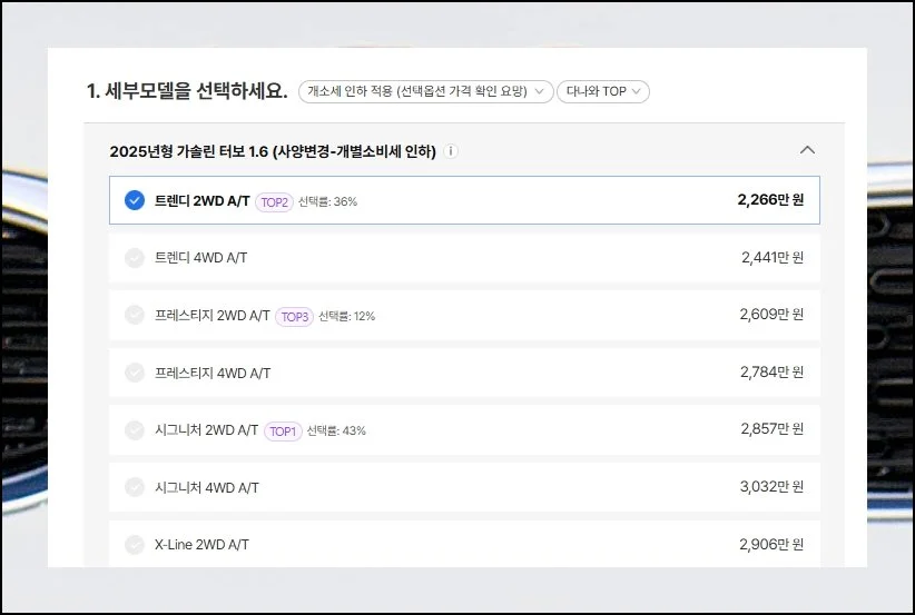 셀토스 구매 시 가장 먼저 체크해야 할 부분이 있어요. 선택한 트림에 따라 금액 차이가 발생합니다.