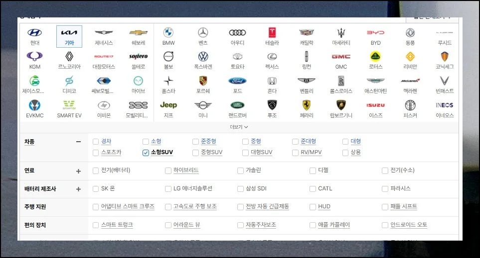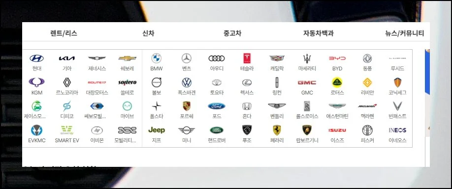 웹사이트 첫 페이지에는 다양한 자동차 제조사가 표시되어 있어요. 기아자동차뿐만 아니라 여러 브랜드를 한 곳에서 확인할 수 있습니다.