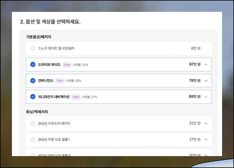 기본으로 제공되는 사양 외에도 선택할 수 있는 항목이 많아요. 여러 옵션을 묶은 패키지 상품도 있습니다.