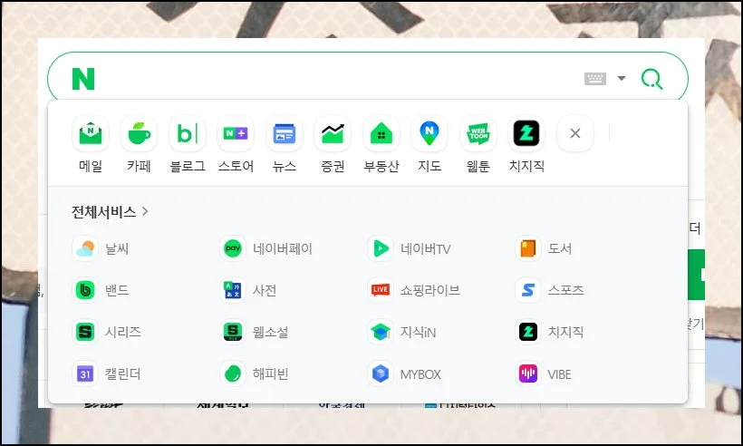 화면 위쪽 검색창 밑을 살펴보면 전체 서비스 메뉴가 보입니다. 여기를 클릭하면 다양한 서비스 목록이 나타나요. 그중에서 사전 항목을 선택하면 됩니다.