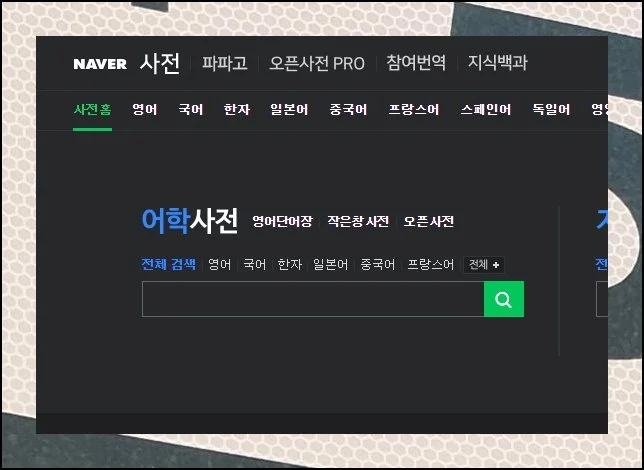 네이버는 영어사전 하나만 운영하는 게 아니에요. 국어는 물론이고 한문에 이르기까지 광범위한 언어 사전 서비스를 갖추고 있습니다.