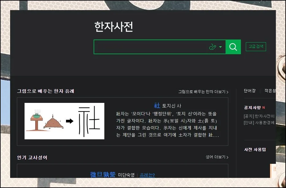 검색어를 입력하는 칸 아래쪽을 보면 흥미로운 콘텐츠가 마련되어 있어요. 한자가 생겨난 유래를 시각적인 그림으로 설명해주고, 일상에서 자주 접하는 고사성어들도 소개합니다.