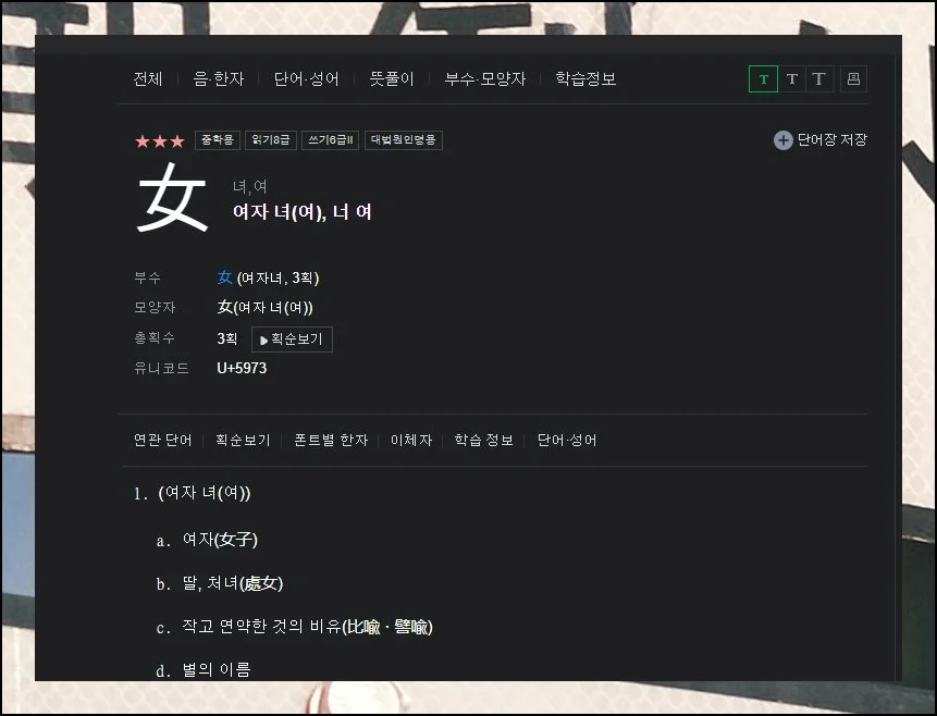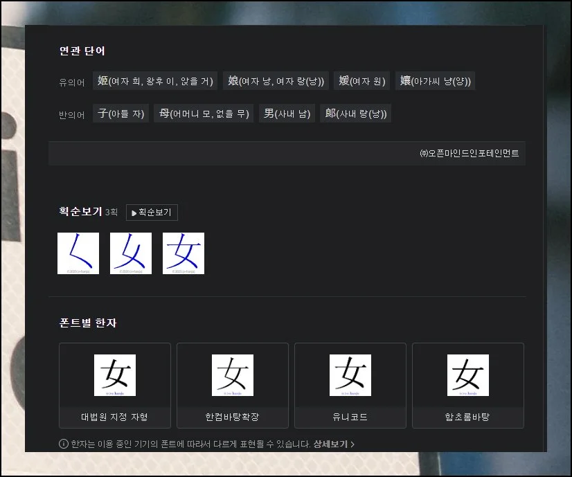 유의어와 반의어 정보를 살펴보면 어휘 능력이 향상됩니다. 한자를 정확하게 쓰는 방법을 익히기 위한 획순 자료도 제공되고 있어요.