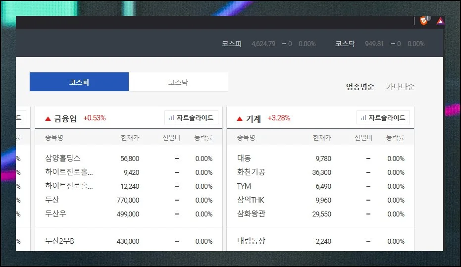 가령 오늘 금융 쪽은 0.53퍼센트 상승했고, 기계 관련 기업들은 3.28퍼센트가량 올랐네요. 업종 평균이 떨어졌다고 해서 그 안의 모든 회사의 증권시세가 모두에 상승하는 것은 아니에요.
