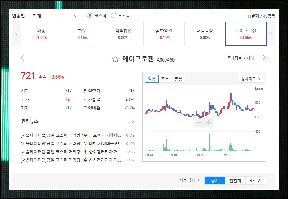 차트슬라이드라는 독특한 도구를 활용하면 해당 업종 안의 모든 기업의 증권시세 데이터를 하나씩 넘겨가며 살펴볼 수 있어요.