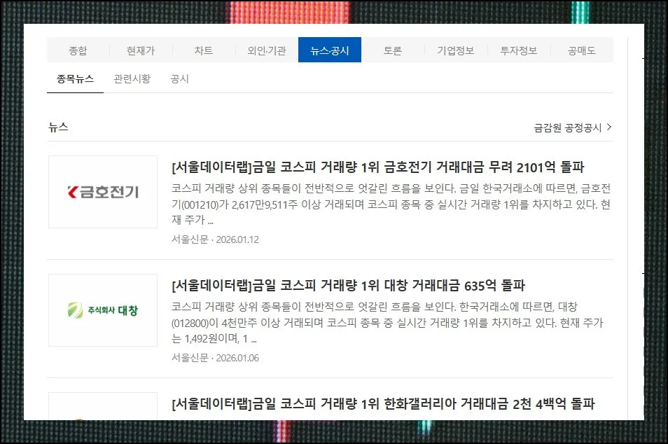 다음이 전달하는 뉴스와 공시 내용은 주가를 좌우하는 핵심 변수예요. 눈여겨보는 종목이 있다면 사이트에서 제공하는 연관 기사들을 꼭 읽어보시길 권해요.
