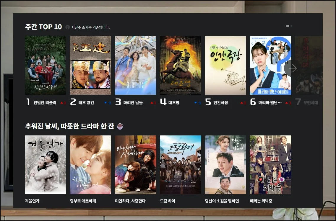 화려한 날들, 대조영, 인간극장 등이 높은 순위를 기록 중입니다. 과거 방영 당시 화제를 모았던 드라마들이 대부분이에요. 전체 회차를 비용 부담 없이 시청할 수 있다는 점이 매력적이죠.