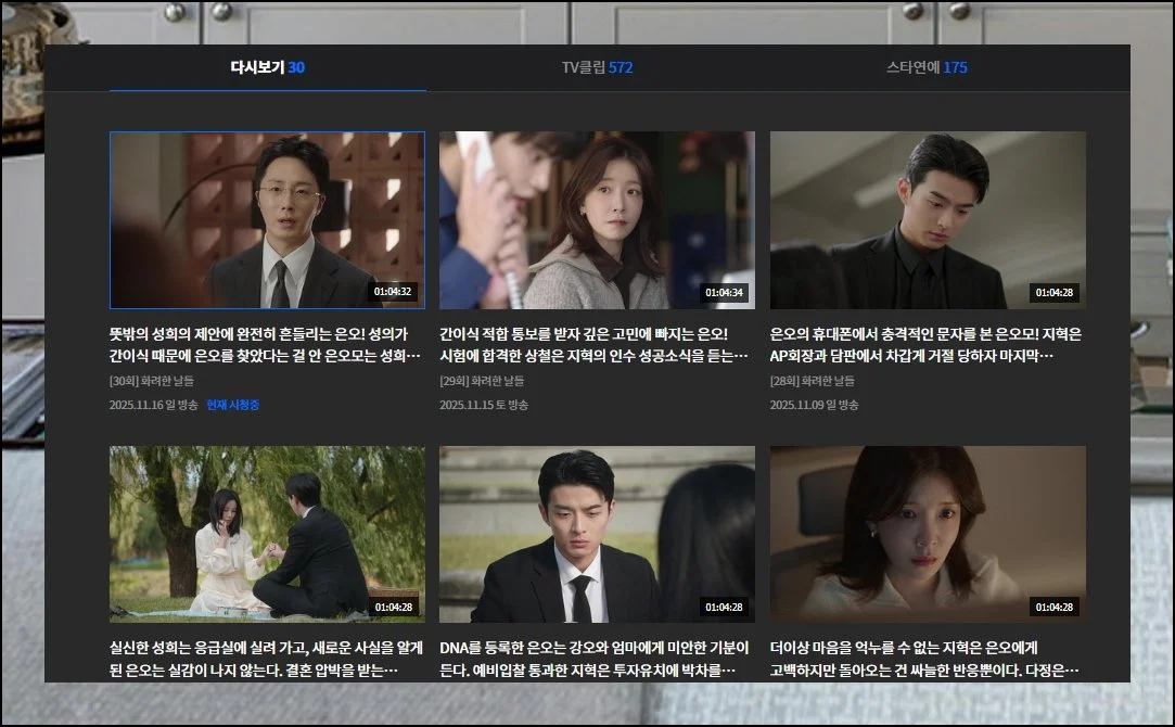 원하는 작품을 선택하면 다시보기 리스트가 화면에 펼쳐져요. 각 회차의 간략한 스토리 소개가 함께 제공됩니다.