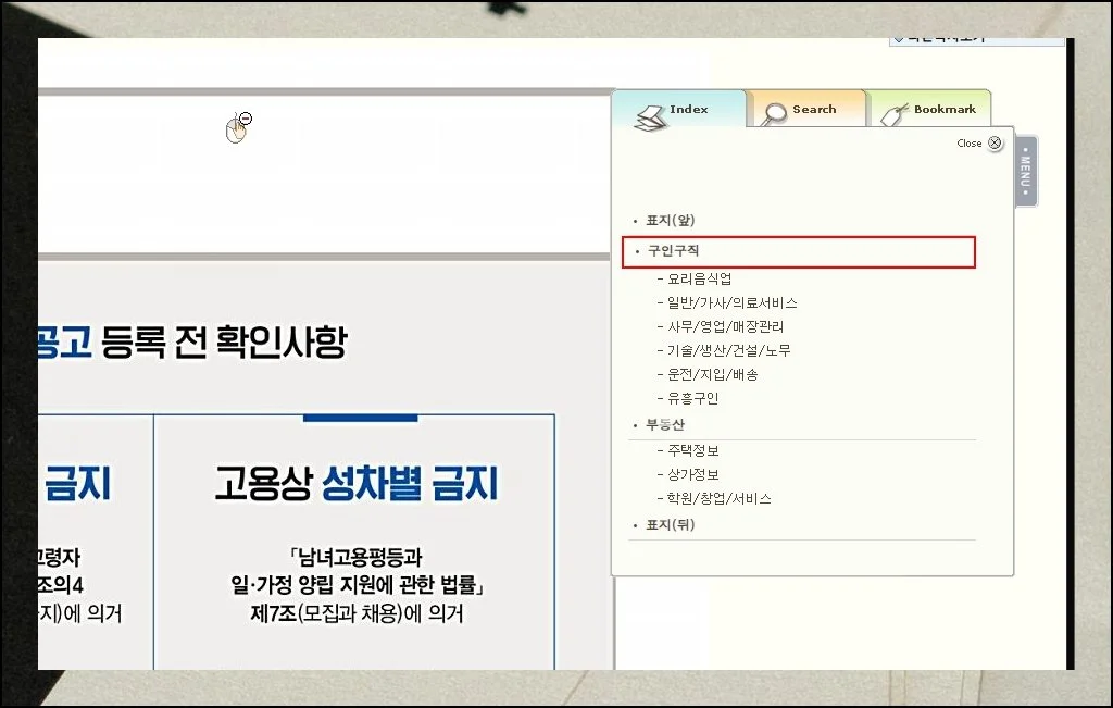 우측 색인 기능은 세분화된 업종 자료를 추적할 때 힘을 발휘해요. 외식업 쪽 채용 건이 궁금하다면 색인에서 해당 업종명을 클릭하세요.