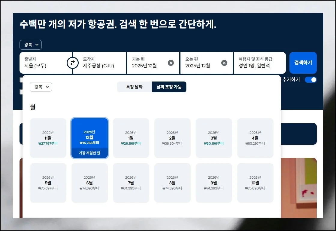 제주행 왕복 비행기표가 29,435원대인 날짜를 찾을 수 있죠. 날짜 선택의 유연성이 있다면 이런 혜택을 누릴 수 있어요.