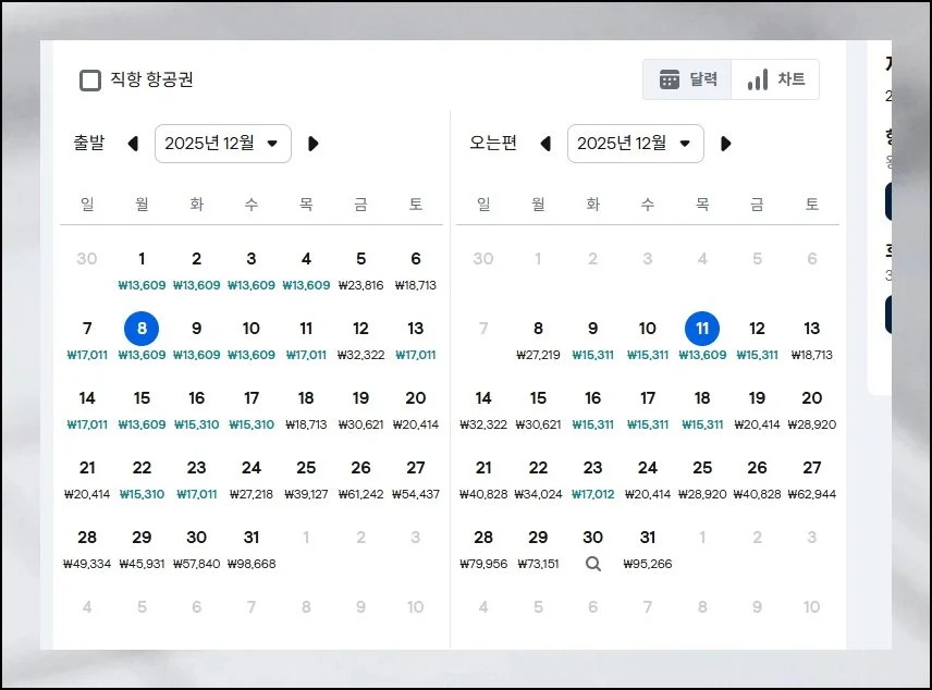 기간은 한 달 전체로 설정하는 게 핵심입니다. 이 두 가지만 정확히 해도 저렴한 티켓 발견 가능성이 크게 올라가요.