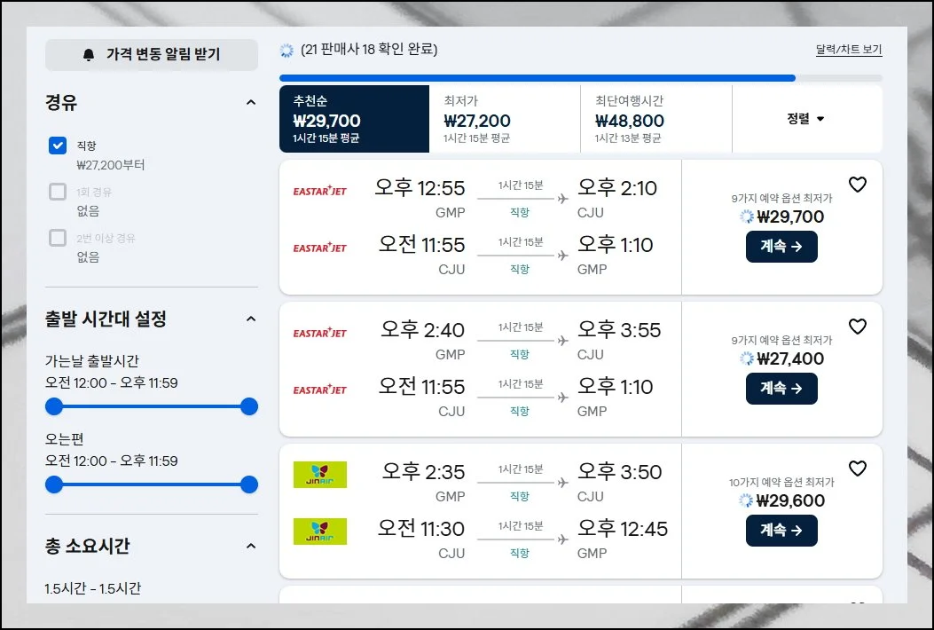 추천순 정렬을 활용하면 요금과 시간을 고려한 최상의 옵션이 상단에 배치돼요.