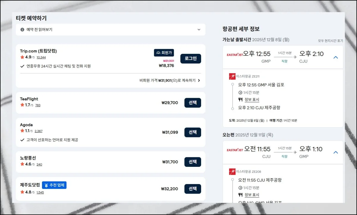 원하는 노선을 찾았다면 예약 대행사 선택이 남았어요. 금액과 평가 점수를 동시에 확인하는 게 중요합니다.