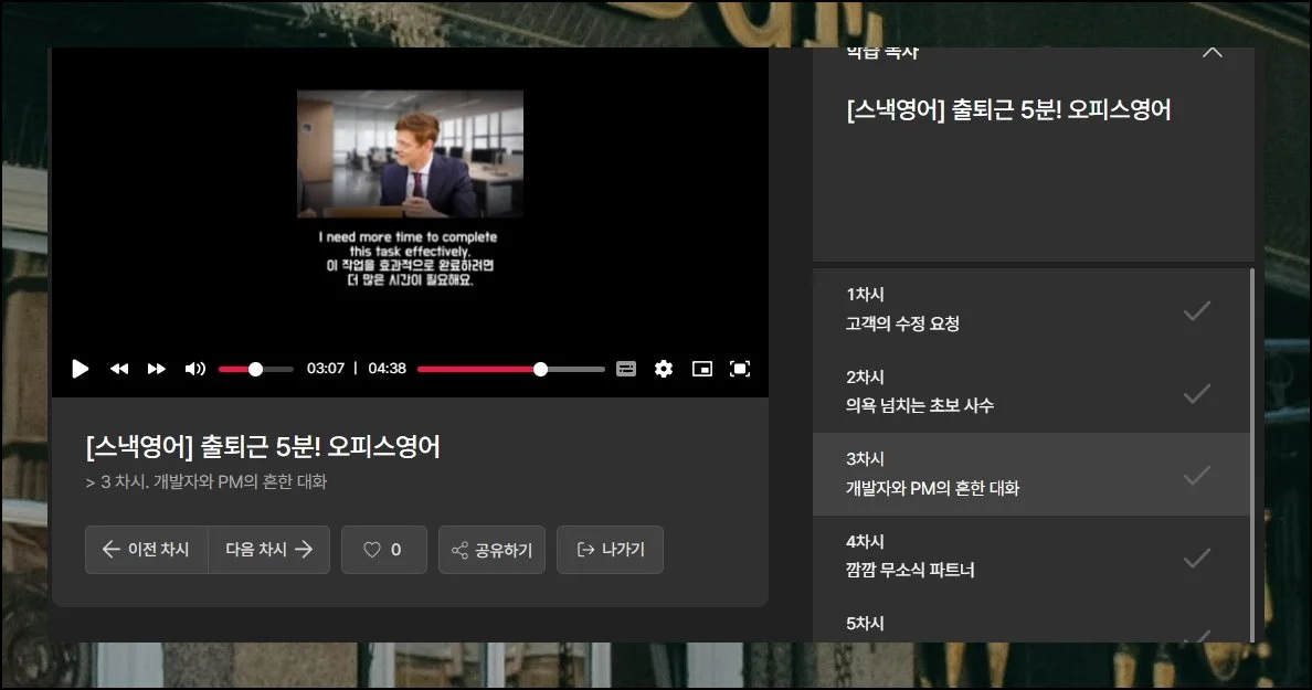 각 회차마다 퀴즈와 요약이 붙어 있어서 배운 내용을 바로 점검할 수 있어요. 내 실력이 어디쯤인지 먼저 파악하고 그에 어울리는 프로그램을 택하는 게 좋은방법이에요.