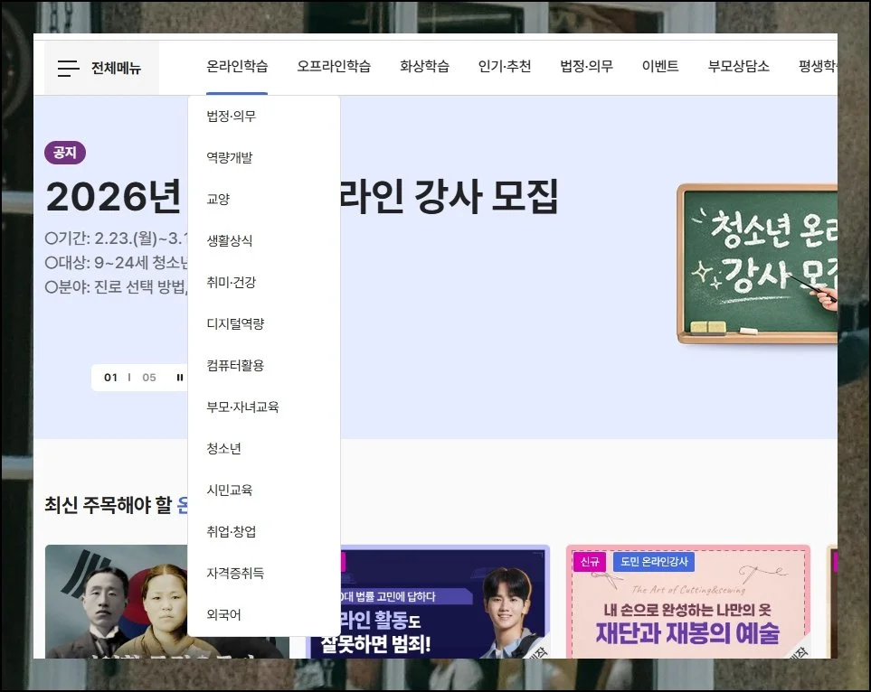 사이트에 들어가면 카테고리가 잘 분류되어 있어서 탐색이 수월해요. 온라인학습 탭을 선택하면 분야마다 정돈된 강좌 리스트가 펼쳐집니다.