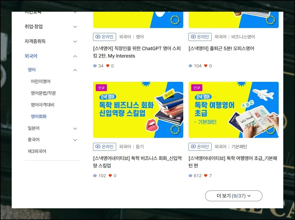 영어 분야 강의가 백 건을 훌쩍 넘을 만큼 방대해요. 영어회화 외에도 문법 이해, 글쓰기 훈련, 자격시험 준비까지 범위가 넓습니다.