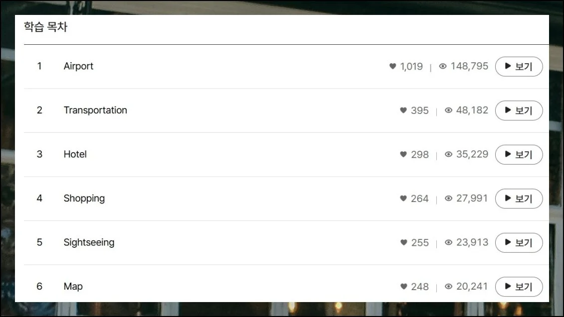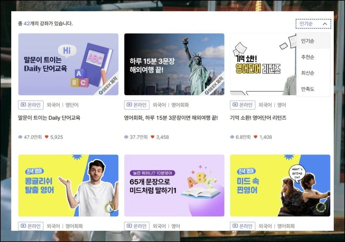 무슨 강의부터 들어야 할지 판단이 서지 않을 때는 인기 랭킹 기능이 좋은방법이에요. 우측 상단에서 인기강좌를 택하면 다수의 학습자가 선택하고 평가도 높았던 영어회화 자료가 상위에 올라옵니다.