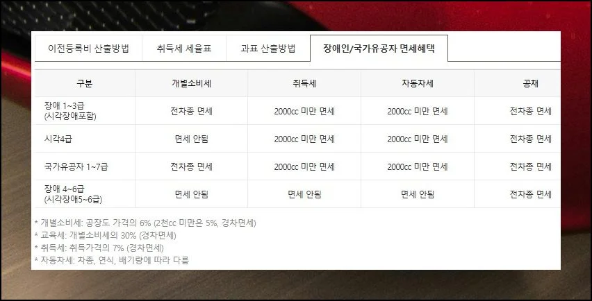 장애가 있으신 분이나 국가유공자분들에게는 취등록세 감면 제도가 마련되어 있습니다. 자동차 엔진 크기에 따라 적용 범위가 바뀌므로 미리 알아두는 편이 현명해요.