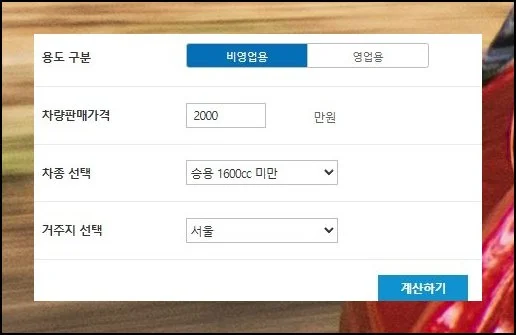 계산기 조작법은 매우 직관적입니다. 구매 예정 금액과 거주지, 사용 목적, 차종을 기입하면 결과가 바로 나와요.