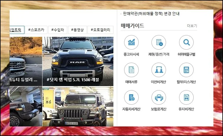 홈페이지에 접속한 뒤 우측 하단 영역을 주의 깊게 살펴보세요. 매매가이드라는 카테고리가 눈에 들어올 겁니다. 여기에는 자동차 관련 실용 도구들이 모여 있어요.