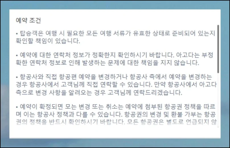 항공사 주의사항을 읽고 구매를 완료하세요. 저가항공권은 추가 서비스가 제한적인 편이에요.