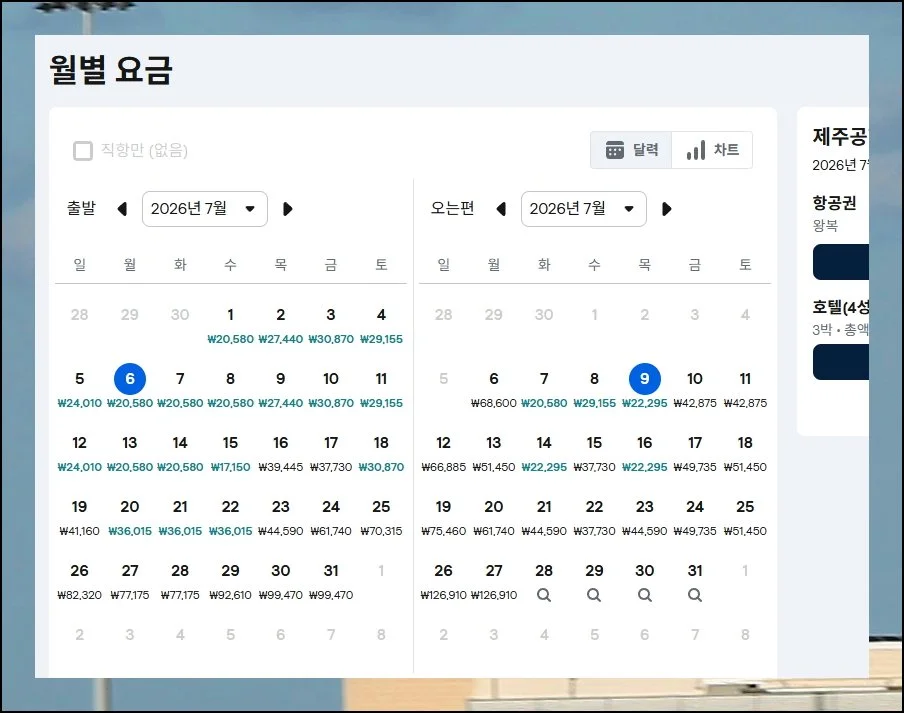 이 기능을 써서 제주 왕복 저가항공권을 33,129원에 찾았어요. 출발일을 조금만 바꿔도 금액에 차이가 생긴다는 걸 알 수 있어요.