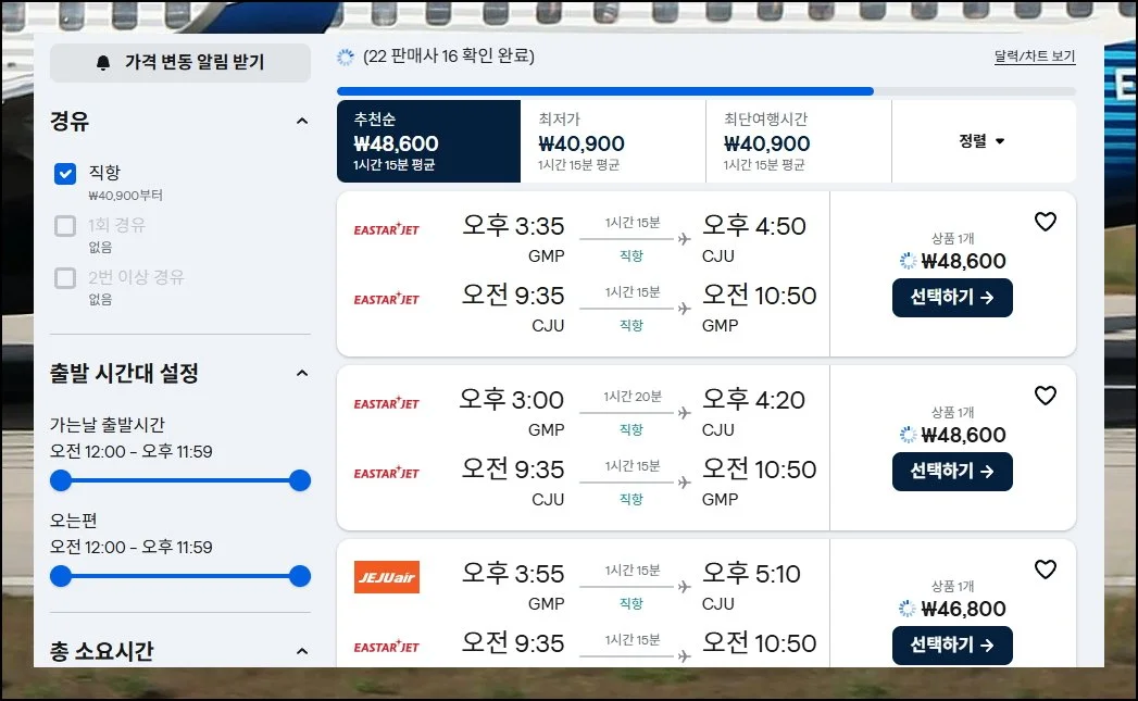 근거리 목적지는 직항만 옵션을 체크하세요. 날짜는 날짜 조정 가능으로 설정하는 게 유리합니다.
