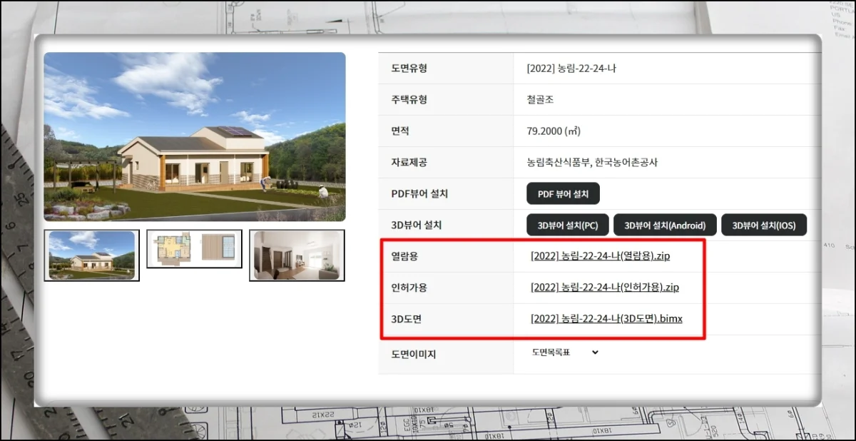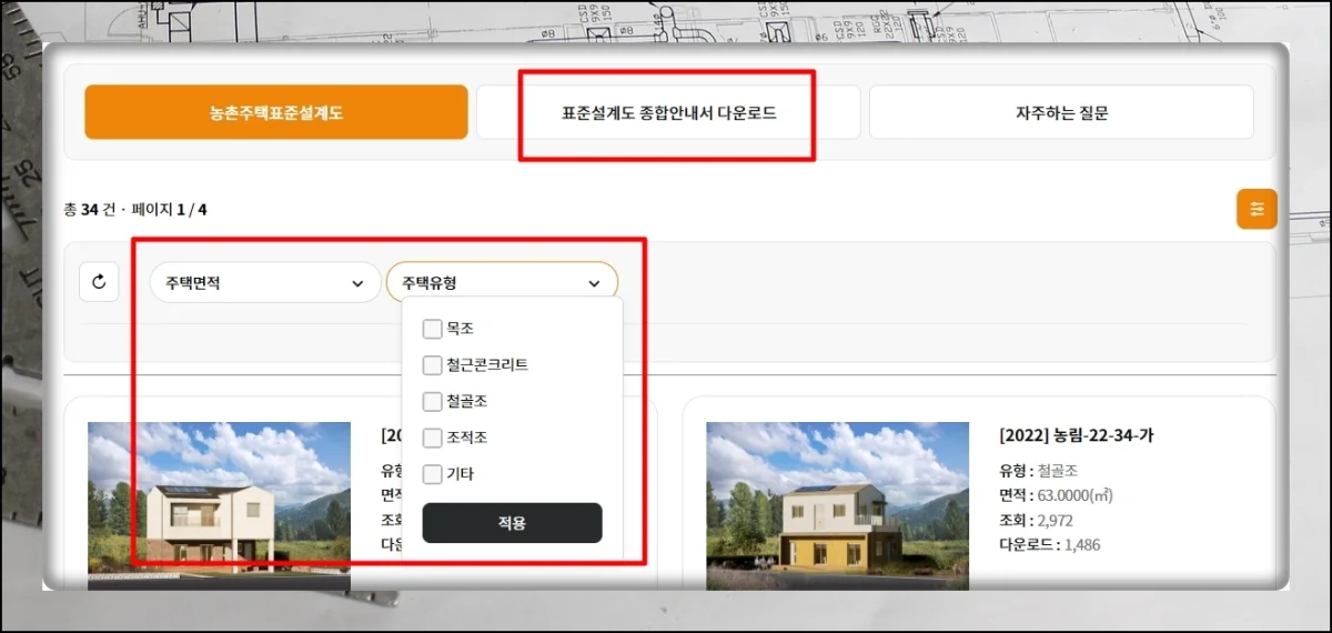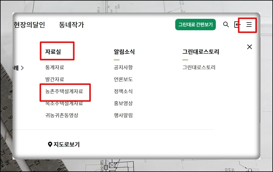 자료실 섹션으로 이동한 뒤 농촌 주택 설계도면 항목을 선택하면 돼요.