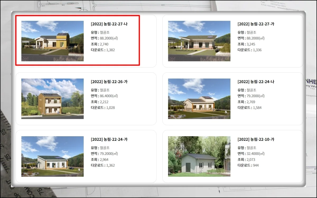 업로드된 설계도면이 꽤 많은 편이에요. 미리보기 사진만 봐도 주택의 생김새를 대략 파악할 수 있습니다.
