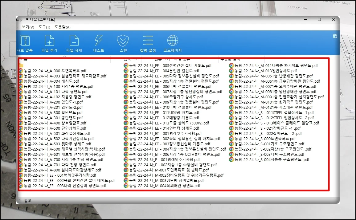 인허가용 압축 파일의 내용을 확인해봤어요. 목록표를 시작으로 각종 평면도와 건물 정면을 보여주는 입면도가 담겨 있습니다.