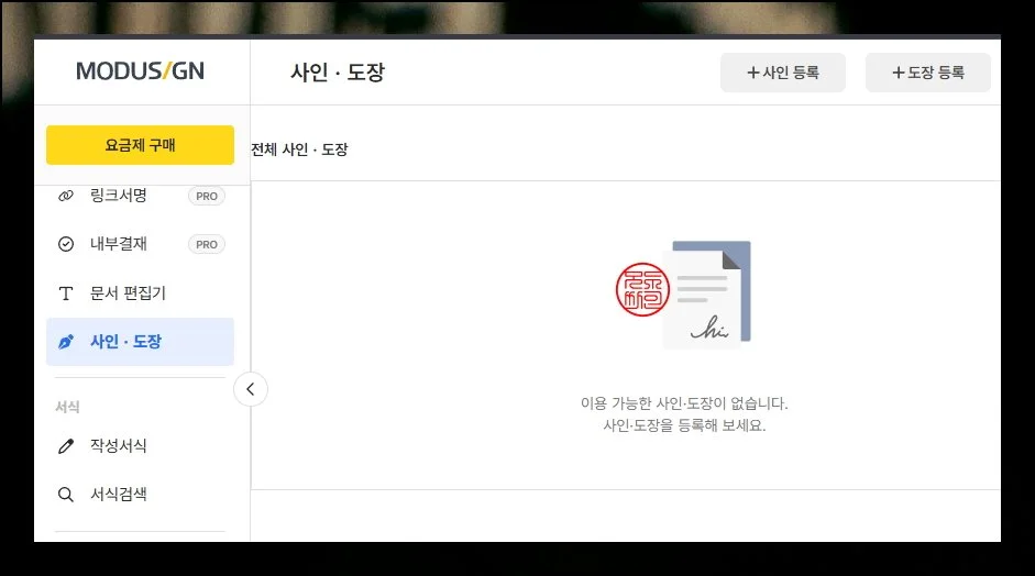 모두싸인 관리 페이지 왼쪽에 있는 사인과 도장 관련 메뉴를 클릭하세요. 오른쪽 화면에 전자서명 제작 서비스가 표시됩니다.
