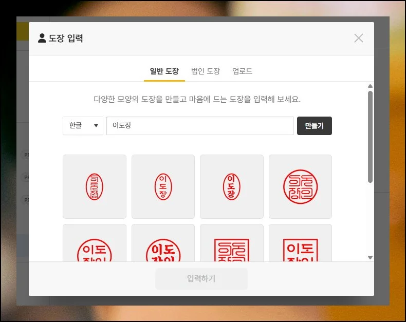 화면 아래쪽에 여러 가지 디자인의 도장 미리보기가 쭉 나타나요. 마음에 드는 스타일을 골라주시면 돼요. 한자도 입력이 가능하니 참고하세요.
