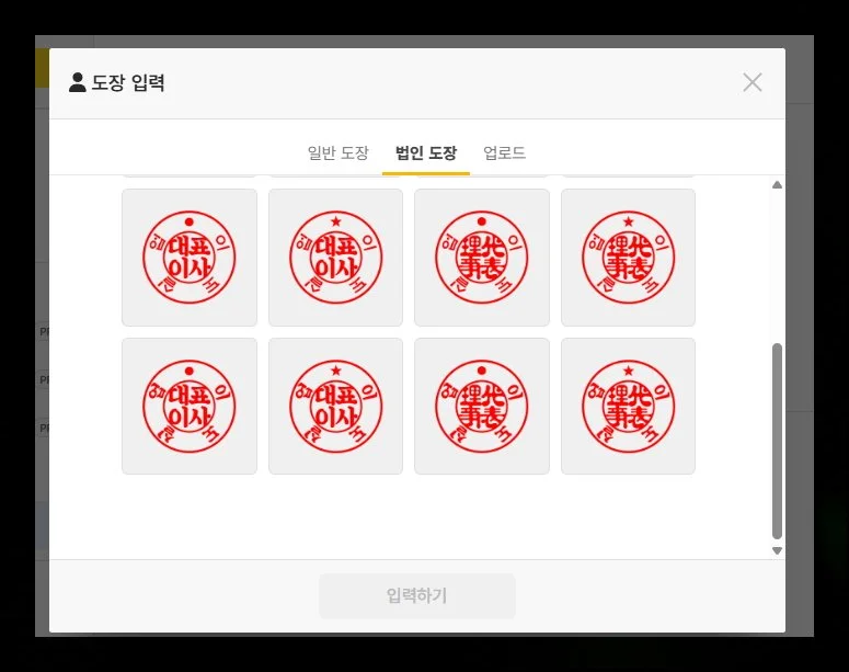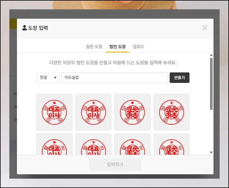 법인용 도장 역시 이곳에서 무료로 작업 가능해요. 법인 회사명을 적고, 입력하기 버튼을 누르면 금방 완성됩니다.
