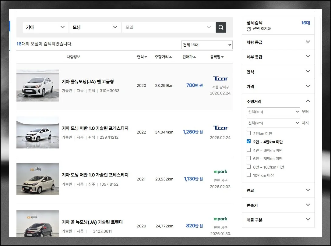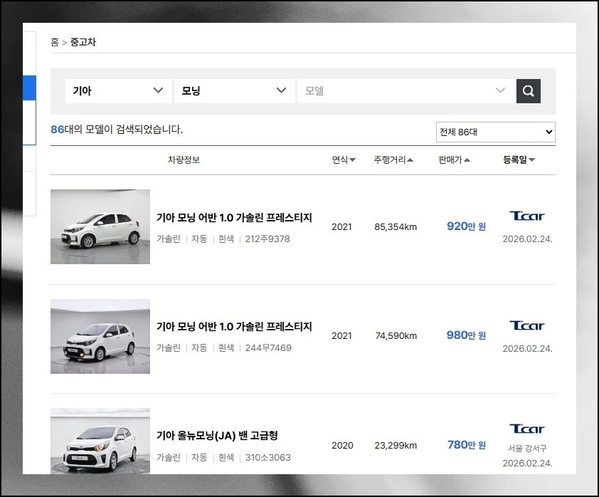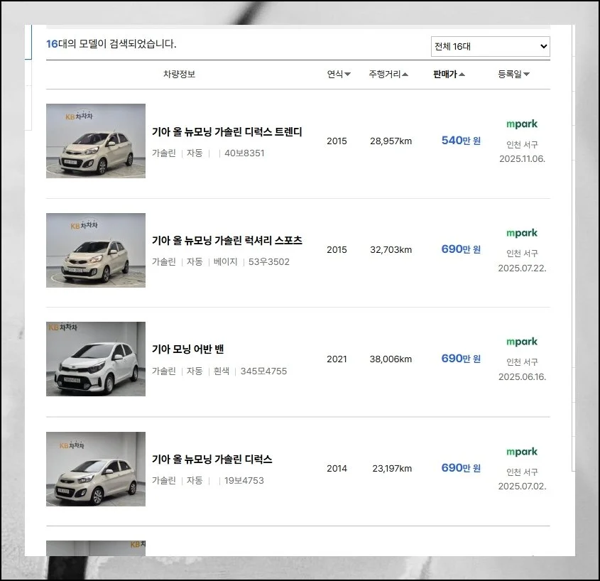 기아 모닝을 예시로 검색해 봤습니다. 제원과 출고 연도, 가격, 누적 운행 거리, 이미지가 목록으로 나열돼요.