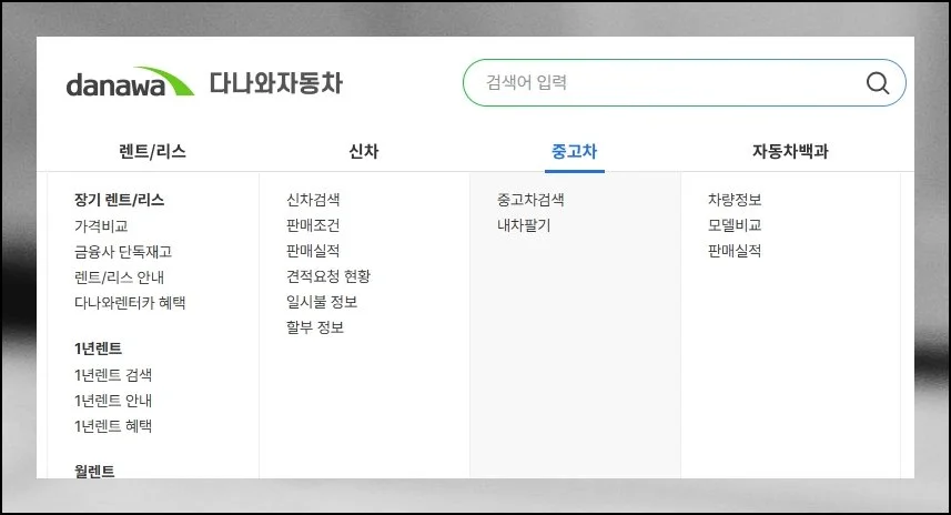 홈페이지에 접속하면 차량 관련 기능이 여럿 보입니다. 신차 견적 산출, 보유 차량 매도, 렌트나 리스 비교 등 선택지가 넓어요.