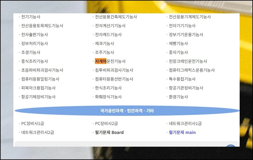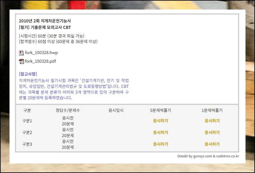국내에서 치러지는 자격증 시험은 대부분 필기와 실기 두 단계로 구성되어 있어요. 건시스템이라는 플랫폼을 이용하면 지게차를 비롯한 여러 자격증의 필기 기출문제를 무료로 확보할 수 있습니다.