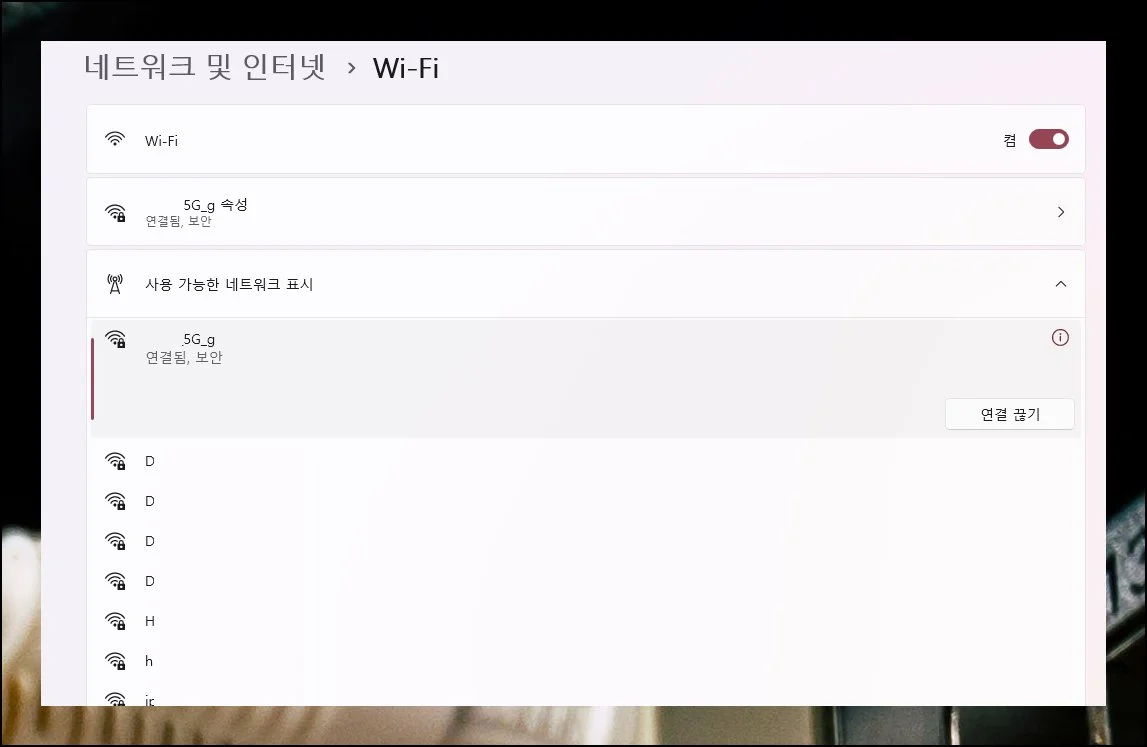 와이파이 설정 창이 열리면 먼저 해야 할 일이 있어요. 끔 상태를 켬으로 바꿔서 무선랜카드를 작동시켜야 합니다. 컴퓨터가 무선 신호를 받을 수 있게 되는 거죠.