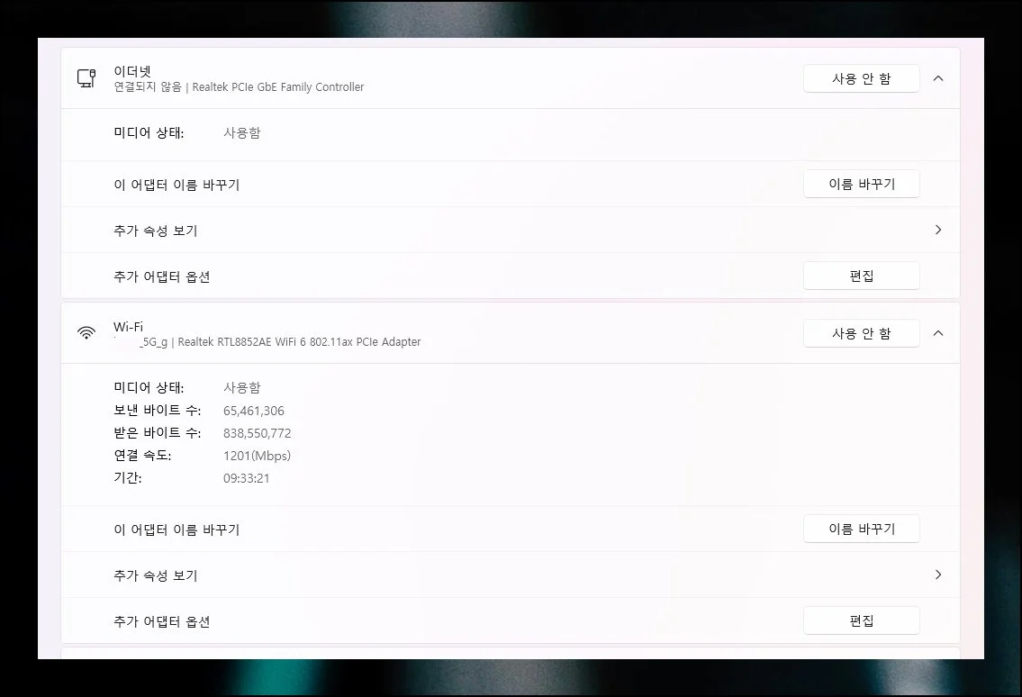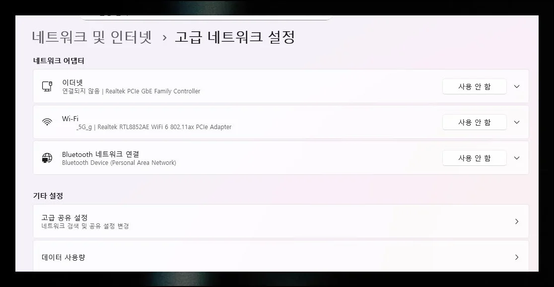 여기서 기타 네트워크 어뎁터 옵션 메뉴를 찾아 클릭하세요.