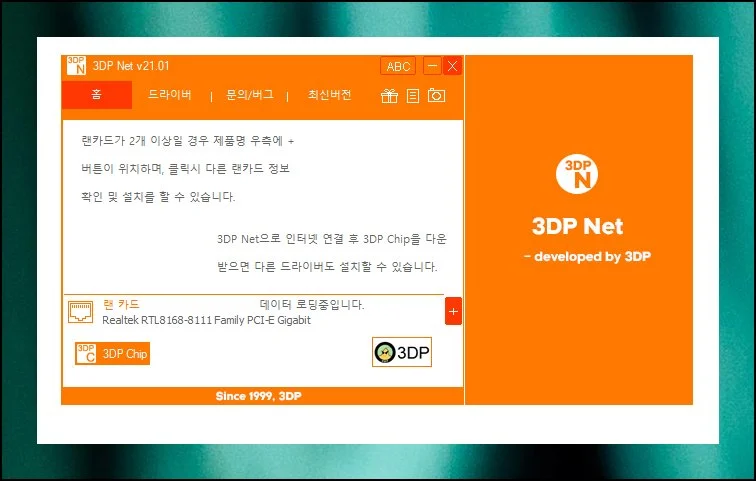 3DP NET 프로그램 설치를 마쳤나요. 실행하면 주황색 화면이 나타날 거예요. 컴퓨터 화면에서 하단을 보면 현재 시스템에 장착된 랜카드 이름이 표시될 거예요.