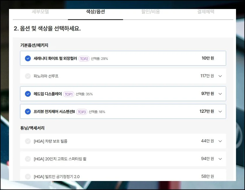 이어지는 과정에서 부가 장비와 차체 색깔을 지정하게 돼요. 어떤 항목을 담느냐에 따라 신차 출고 비용 격차가 제법 벌어집니다.