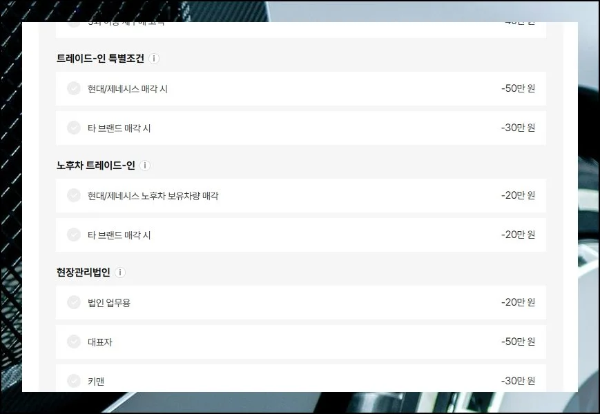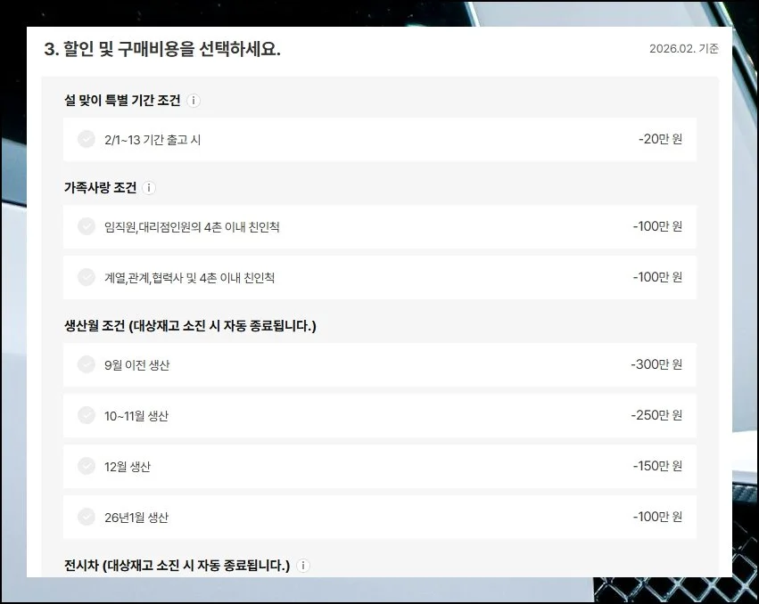 판매 조건 지정 구간에서는 자신에게 해당하는 감면 내역을 직접 반영합니다. 자격이 되는 항목을 빠짐없이 고르면 그 액수만큼 총액에서 제외돼요.