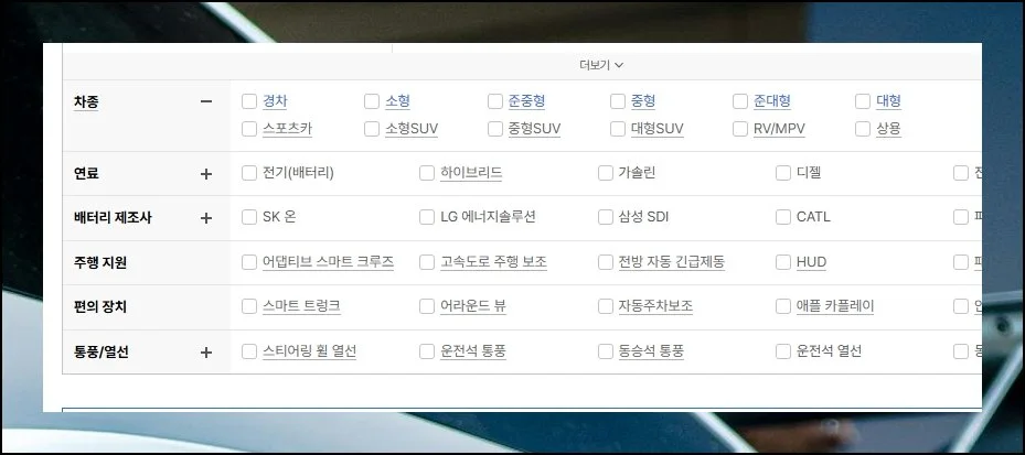 메이커를 지정하면 구체적 요구 사항을 기입하는 창이 열립니다. 차체 유형이나 동력원, 보조 장치 유무를 개별 설정하는 게 가능해요.