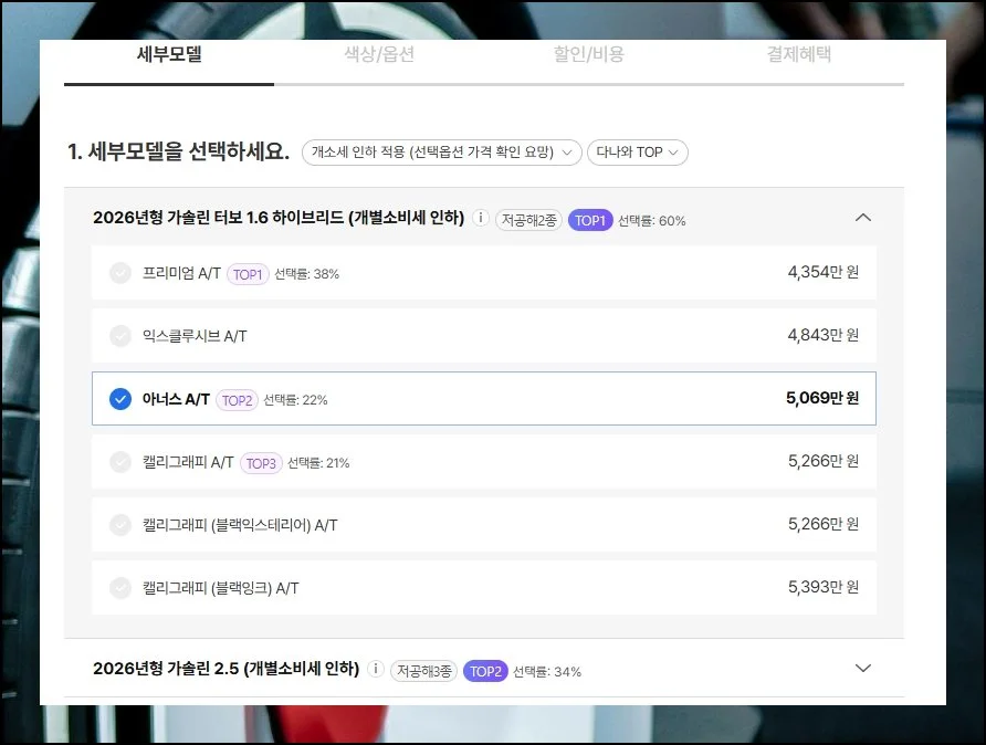 필터에 부합하는 차종 목록이 뜨면 가격대가 범위로 구분되어 보여요. 실제 총액을 파악하려면 세부 항목을 더 골라야 합니다.