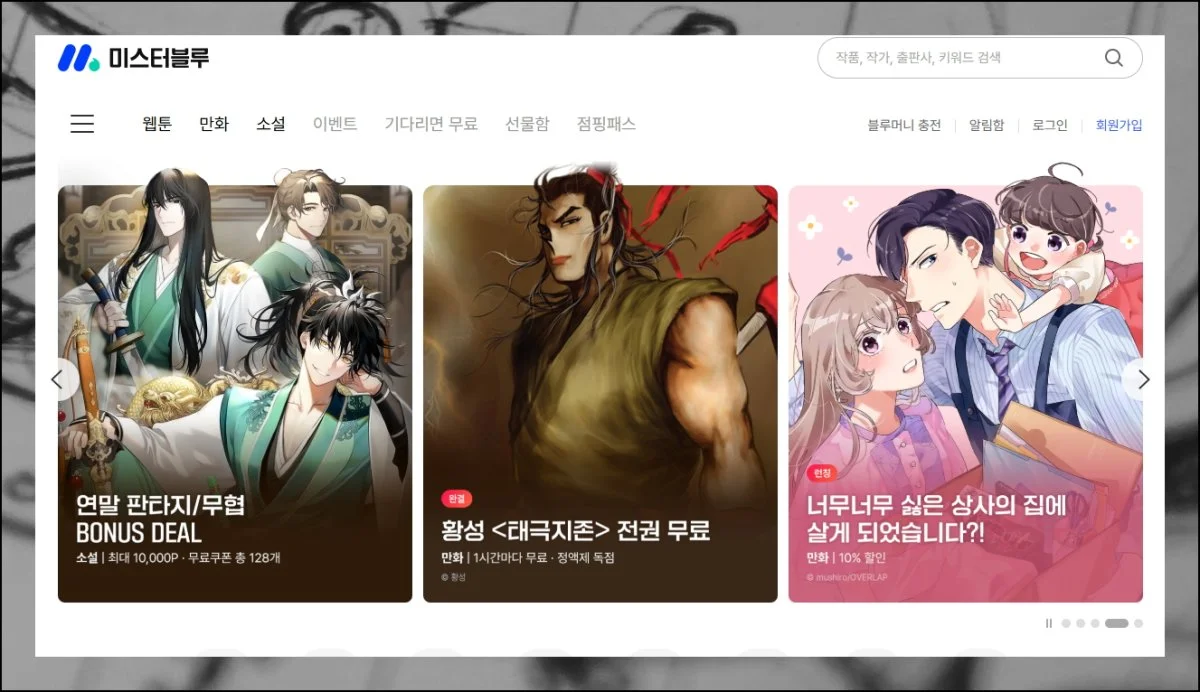 미스터블루는 웹툰, 만화, 소설 등 정말 많은 볼거리를 제공하는 플랫폼이에요. 황성 작가의 작품을 포함해 다양한 무료만화를 즐길 수 있는 이벤트가 자주 열립니다.