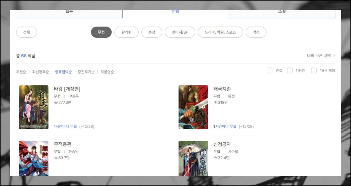 카테고리에 들어가면 무협관, 특별관 등 여러 섹션이 나타나요. 지금 무료 버튼을 누른 후 무협 부분에서 황성을 검색해 보세요.