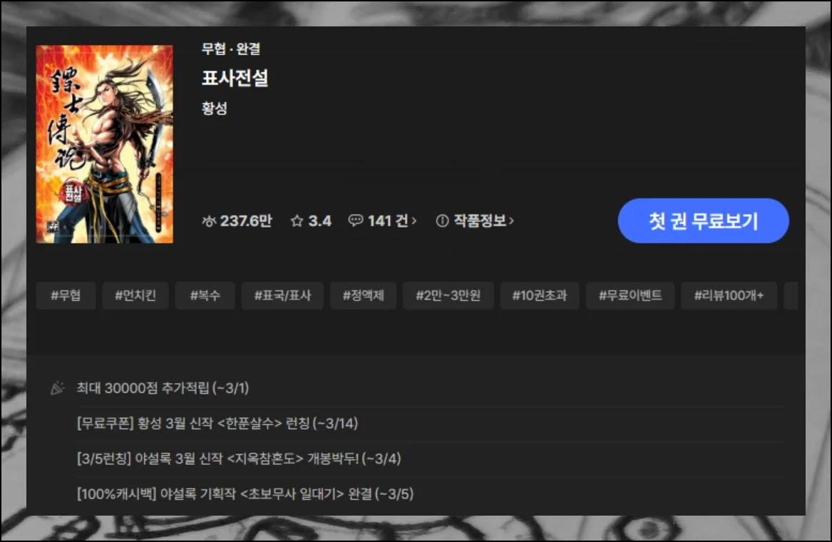 표사전설을 선택하면 별점 3.4점으로 독자들에게 인기가 높은 작품임을 확인할 수 있어요. 조회수는 237.6만회로 엄청난 관심을 받고 있습니다.