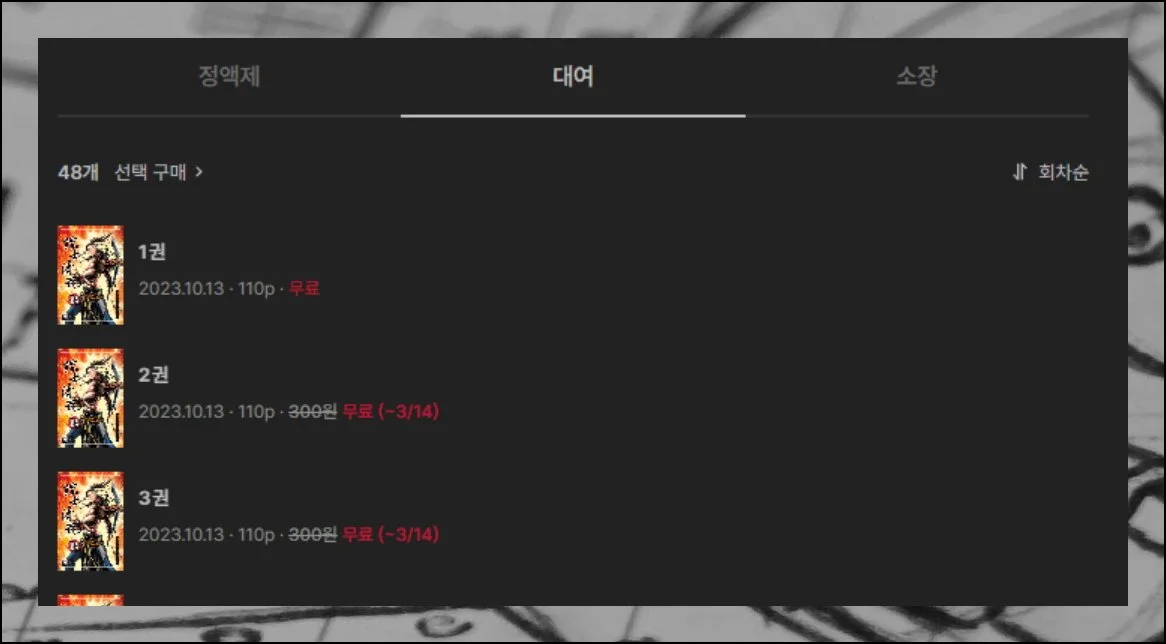 다른 방법으로는 대여 탭을 누르셔서 원하는 권을 직접 선택해 볼 수도 있어요. 이 기능은 특정 권부터 읽고 싶을 때 사용하면 좋습니다.